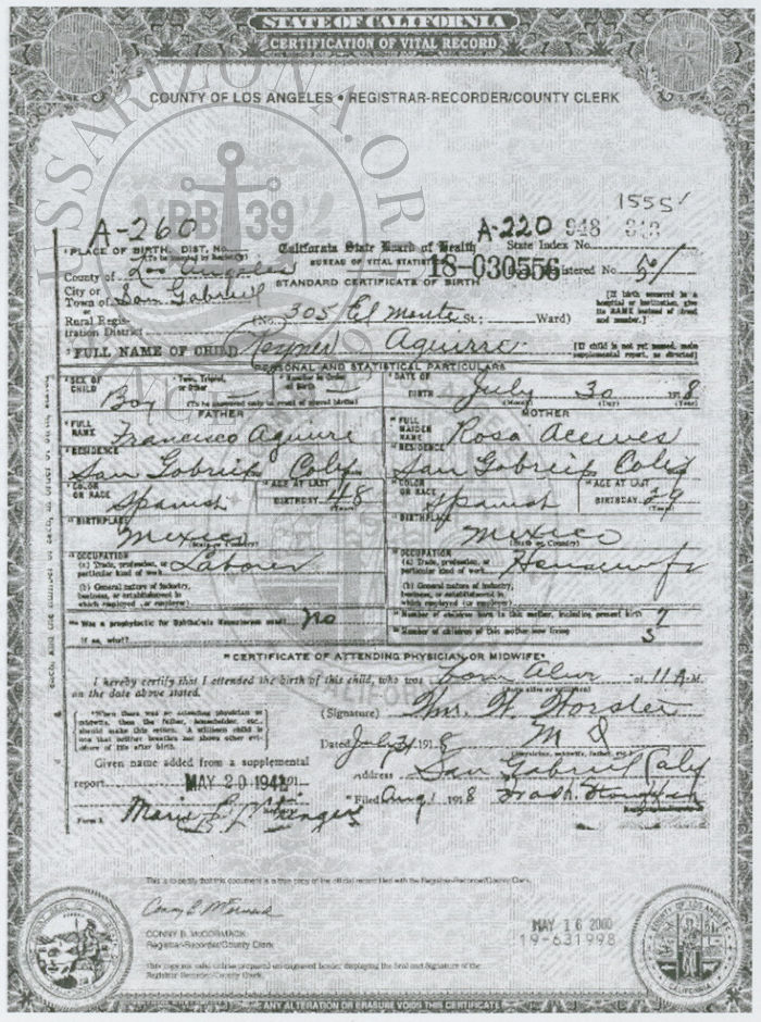 Reyner Aceves Aguirre was born July 30, 1918, in San Gabriel, California. He was the youngest of five children of Rose Aceves Aguirre, a homemaker, and Francisco Aguirre, a gardener. The parents were immigrants from Mexico.