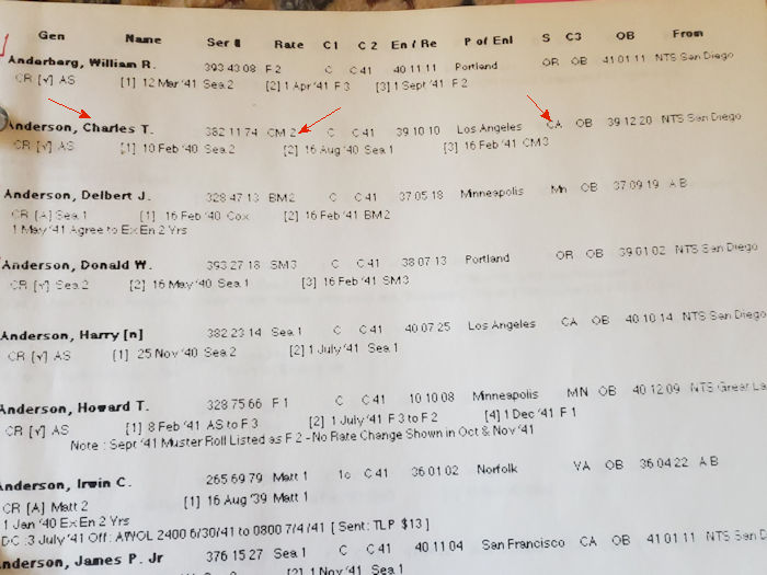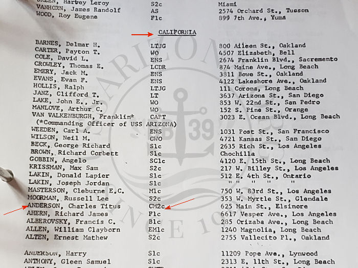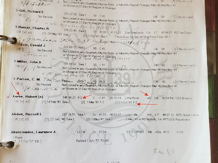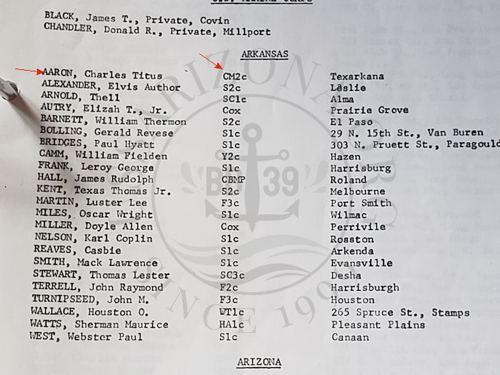 I believe the transcription error was first was made when the Casualty by States list was created decades ago and the first name on the Arkansas list was a mix of Hubert Aaron and Charles Titus Anderson. On the original Casualty by States list under Arkansas the listing is “Aaron, Charles Titus” and rate of CM2c. This was taken from Charles Titus Anderson, CM2/c from California. From there, the only correction that appears to have been made over time was the addition of his first name “Hubert” and correcting his rate to F2/c, leaving the incorrect transcription of “AARON, Hubert Charles Titus, F2/c” on most lists today, which is incorrect.