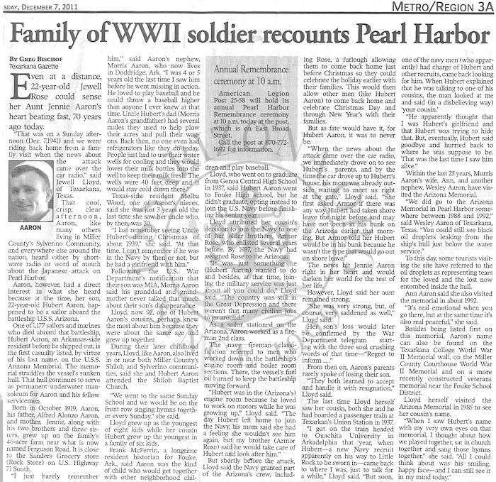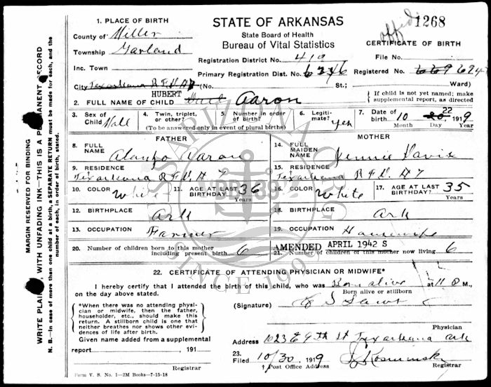 In an interview for the Texarkana Gazette in 2011, his family only refers to him as Hubert Aaron. It would be logical to think if his name was Hubert "Charles Titus" Aaron, they surely would have mentioned it in the article. It is true he may have had a middle name that was not on any official documents but may be listed in a family bible, church record, or other family documents and memorabilia, but again it seems logical to me the family would have mentioned it. One thing is fact, his name was NOT Hubert Charles Titus Aaron.
