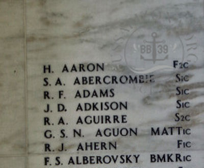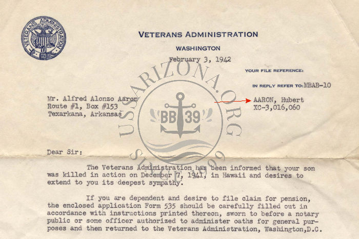 Hubert Aaron is incorrectly listed on many casualty lists and other modern resources as “Hubert Charles Titus Aaron”. He is the first name on every list and inscribed (correctly) on the Memorial Wall. Let's get this right! His Birth Certificate shows no middle name. He is listed on most muster rolls and crew data sheets as Aaron, Hubert (n). According to USS Arizona Survivor, Vincent James "Jim" Vlach, the use of (n) after a name on the muster rolls designates no middle name (not used on final ROC). Other government documents from that time show him as simply Hubert Aaron. Also note that the Memorial Wall lists him as only “H. Aaron” with no other initials. (See Supporting Documents below for reference)